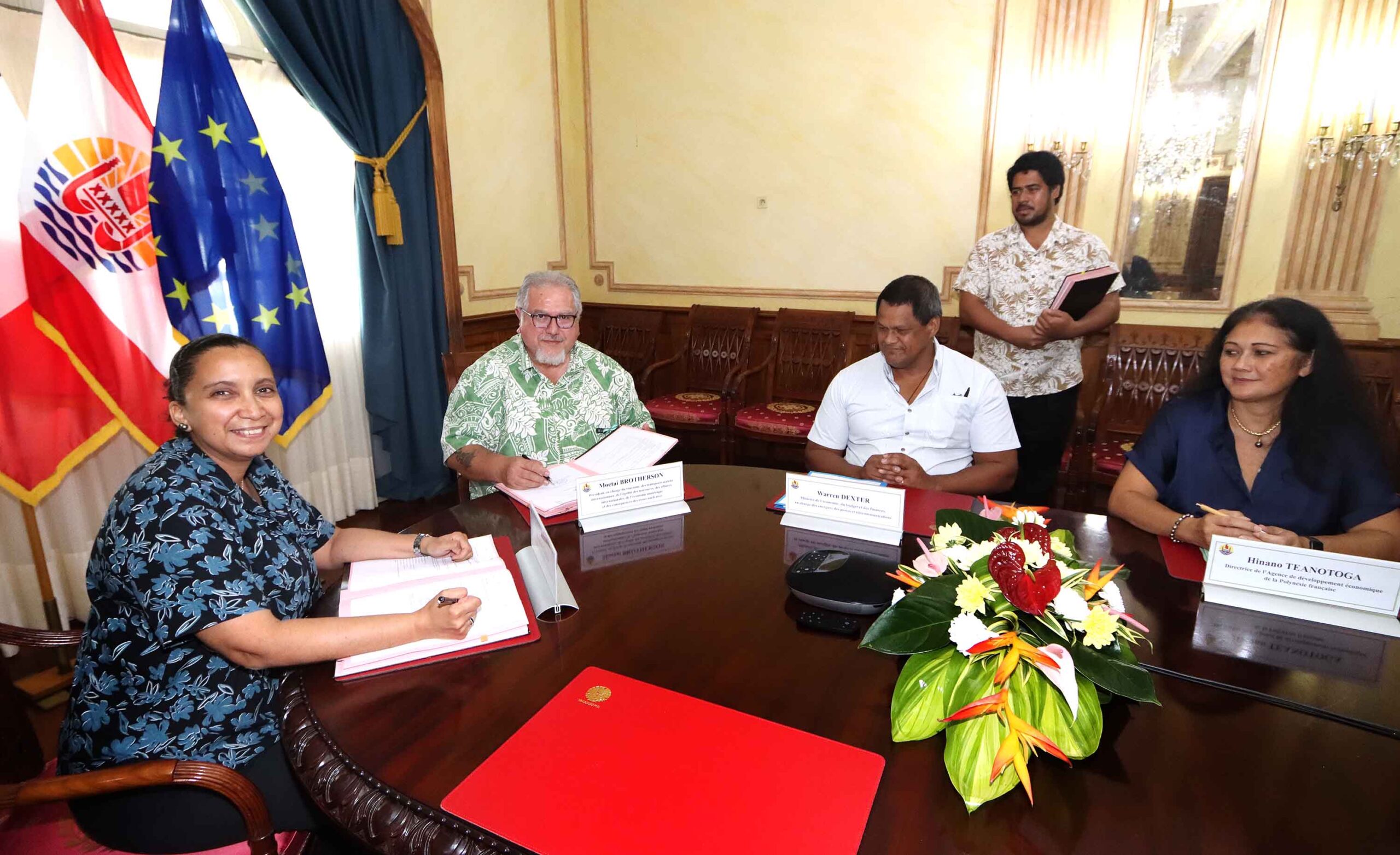 La cérémonie de signature s’est tenue à la Présidence, en présence de Moetai BROTHERSON, Président de la Polynésie française, de Mounia AIT OFKIR, Directrice de l’AFD en Polynésie, ainsi que de Warren DEXTER, ministre de l’Économie et de Hinano Teanotoga, Directrice de l’ADE.