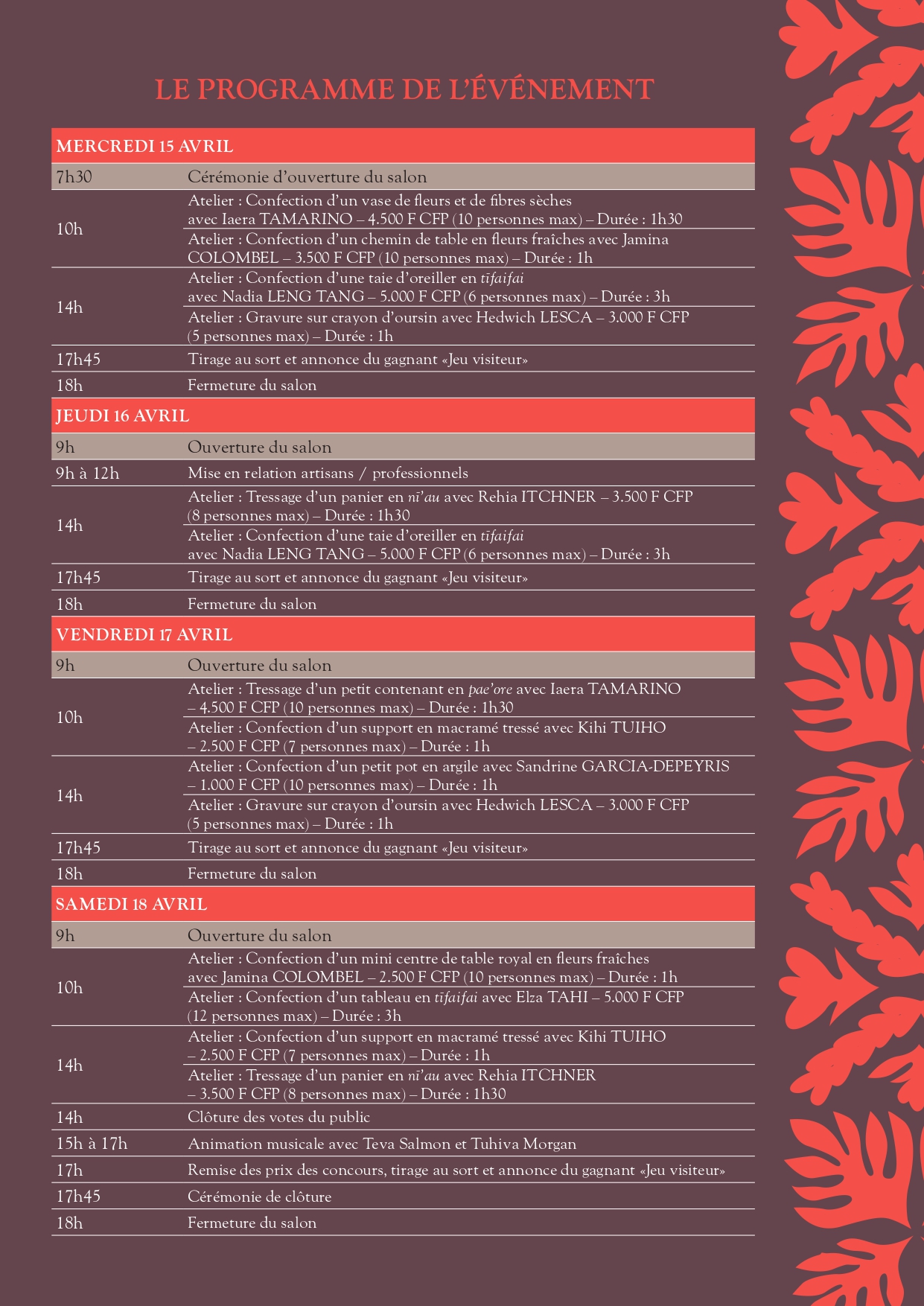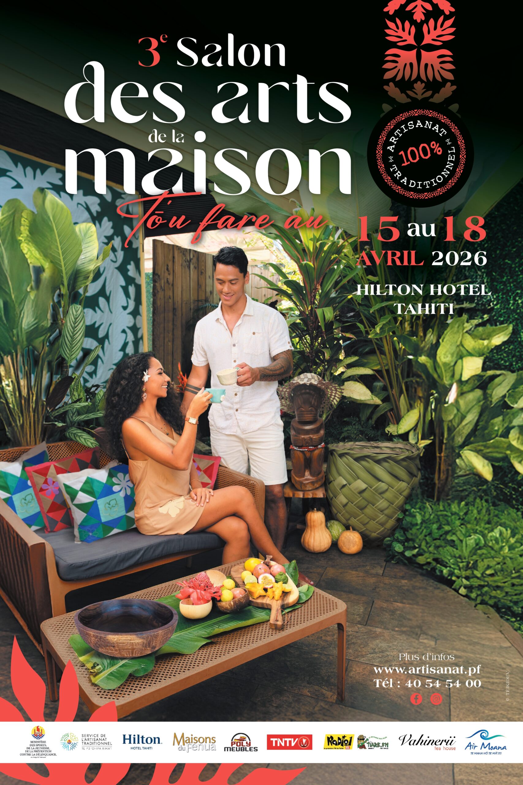 Sous l’égide du Ministère des Sports, de la Jeunesse et de la Prévention contre la délinquance, en charge de l’Artisanat, le Service de l’artisanat traditionnel – Te Pū ‘ohipa rima’ī organise la 3e édition du Salon des arts de la maison, du mercredi 15 au samedi 18 avril 2026 au Hilton Hotel Tahiti à Fa’a’ā.