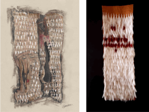 Croquis du potentiel fragment de maro’ura / Expérimentation de reconstitution d’une partie de l’objet par Orama Nigou.