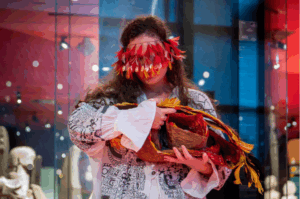 Là-bas, elle est entrée au Musée du Quai Branly par une autre performance. Lors d’une procession chantée et aux côtés de Stéphanie Leclerc Caffarel, responsable des collections d’Océanie au Musée du Quai Branly, Orama Nigou a déambulé avec l’œuvre à travers le plateau des collections jusqu’à la vitrine qui allait l’accueillir. L’objet fût ainsi présenté au lieu et aux précieux artefacts qu’il allait désormais côtoyer.