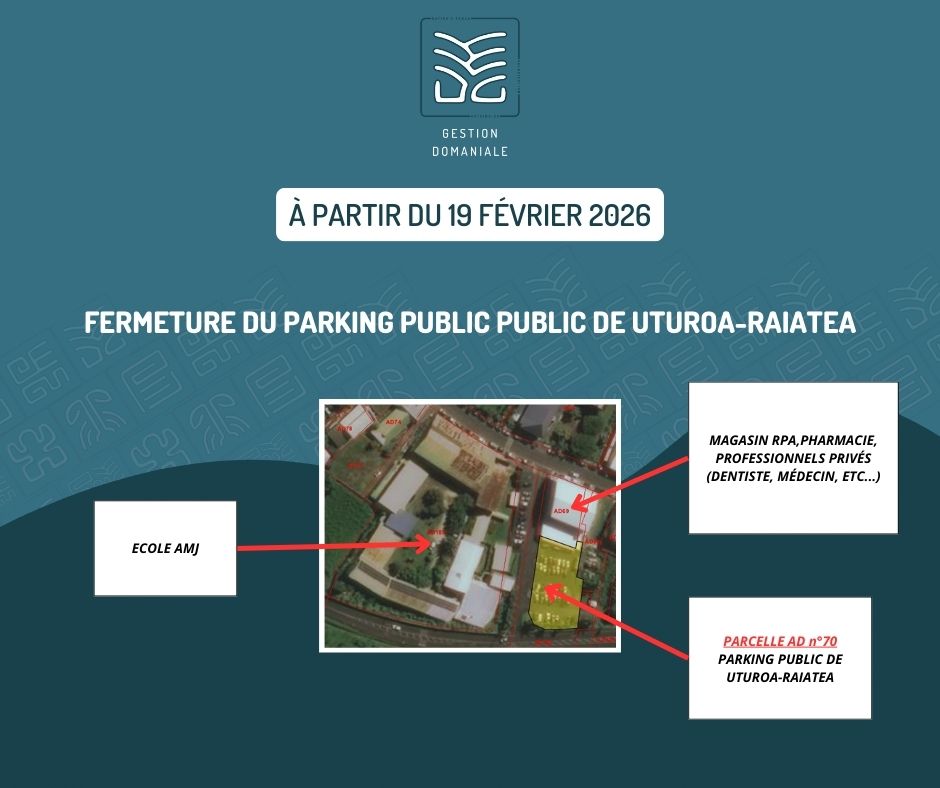 La Direction des affaires fonciรจres (DAF) informe la population de Raiatea que le ๐ฉ๐๐ซ๐ค๐ข๐ง๐ ๐ฉ๐ฎ๐๐ฅ๐ข๐ situรฉ sur ๐ฅ๐ ๐ฉ๐ฅ๐๐ญ๐๐๐ฎ ๐๐๐ฌ de la ๐ฉ๐๐ซ๐๐๐ฅ๐ฅ๐ ๐๐จ๐ฆ๐๐ง๐ข๐๐ฅ๐ ๐๐ ๐๐ sise dans la commune de โ๐๐ญ๐ฎ๐ซ๐จ๐, ๐ฌ๐๐ซ๐ ๐๐๐ซ๐ฆ๐ฬ pour des raisons de sรฉcuritรฉ, ร compter du ๐๐ ๐๐ฬ๐ฏ๐ซ๐ข๐๐ซ ๐๐๐๐.