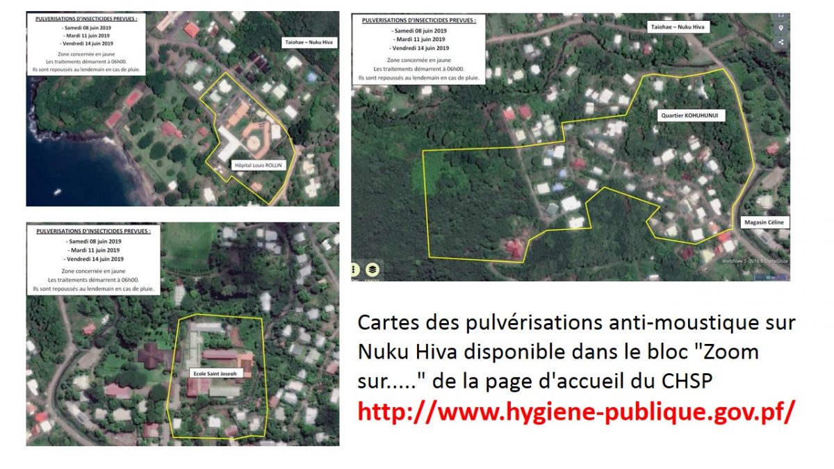 En prévision de la campagne de lutte anti-moustique du Centre d’Hygiène et de Salubrité Publique (CHSP) les 8, 11 et 14 juin 2019 à partir de 6h00 du matin dans les quartier Kohuhunui, école saint-joseph et hôpital Tai o hae à Nuku Hiva. Toute les cartes et informations sont disponibles dans le bloc « Zoom sur….. » de la page d’accueil du CHSP http://www.hygiene-publique.gov.pf/