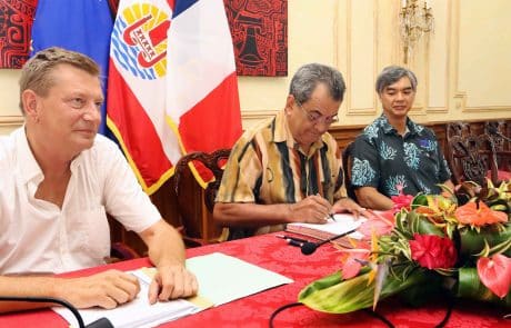 Le Président de la Polynésie française, Edouard Fritch, a signé en fin de matinée la Convention de financement du « Programme européen d’appui à la gestion de l’eau en Polynésie française », en présence de l’Ambassadeur de l’Union européenne (UE) pour le Pacifique, Sujiro Seam, du Haut-commissaire de la République française, Eric Spitz, et de membres du Gouvernement, dont le ministre de la Culture, de l’Environnement et des Ressources marines, Heremoana Maamaatuaiahutapu.