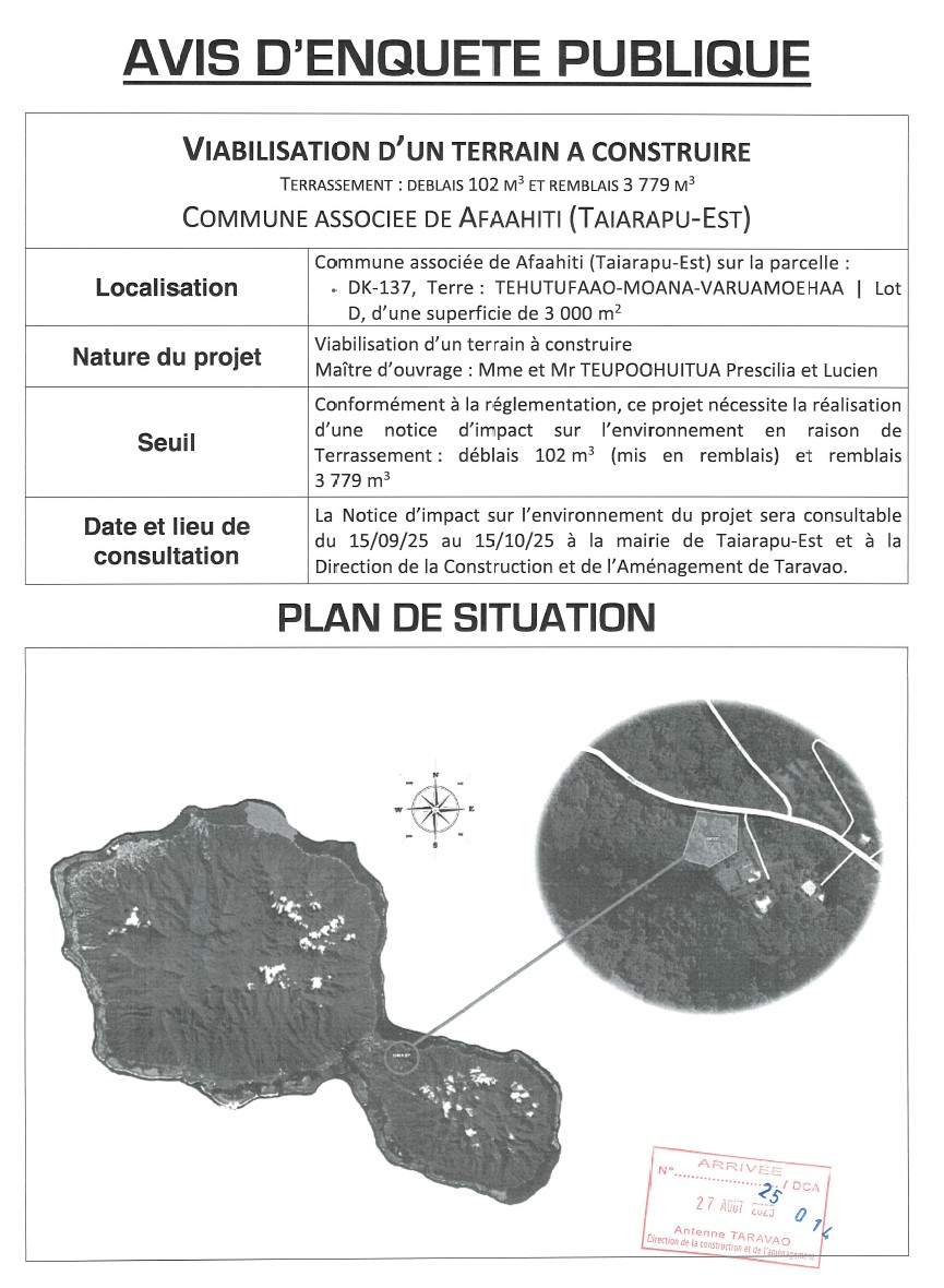 Published On: août 12th, 2025Catégories : Études d'impactsProjet Parc VAIPARAOA L’Étude d’Impact sur l’Environnement concernant Aménagement du Parc Vaiparaoa, nécessitant 7 310 m3 de remblais et l’abattage de [ lire la suite ->]