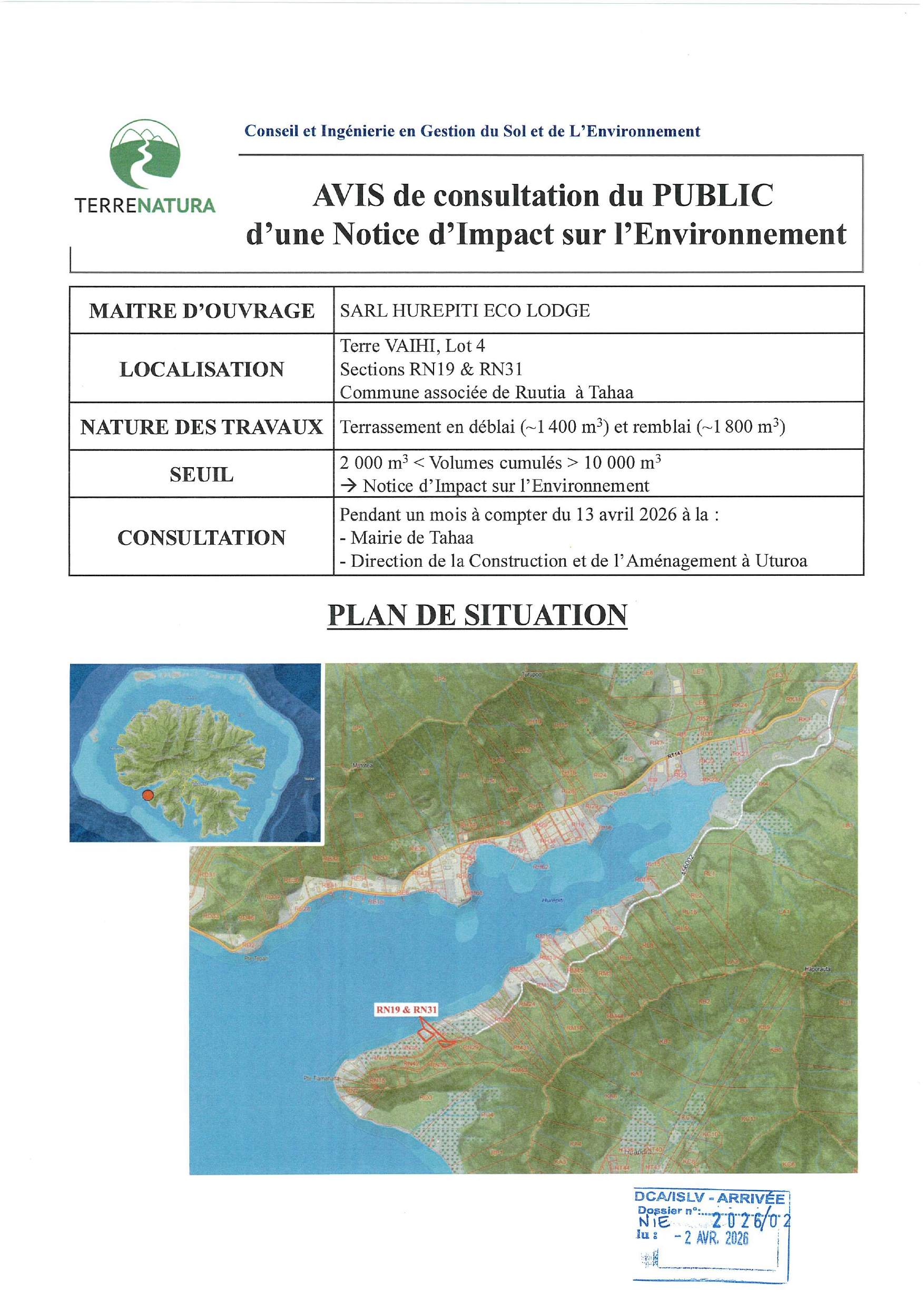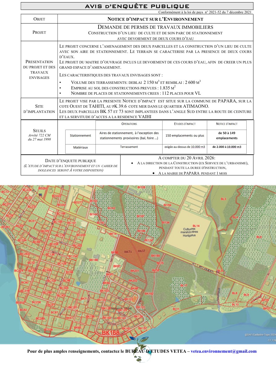 Ia Ora Na, Nous sommes ravi de vous informer qu’à partir du 20 avril 2026 et ce durant un mois, vous pourrez consulter la notice d'impact sur l'environnement pour la construction d'un lieu de culte et de son parc de stationnement avec dévoiement de deux cours d'eau, parcelles BK 57 et 73, commune de Papara. [ lire la suite ->]