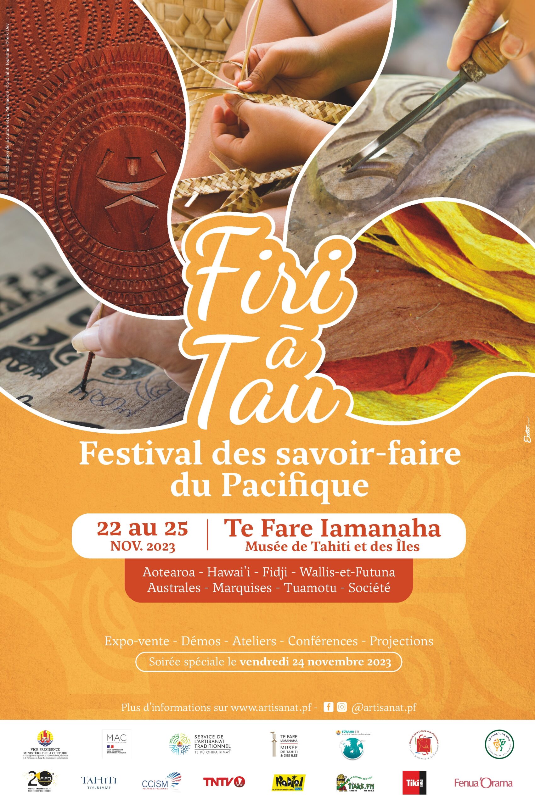 Le Festival des savoir-faire du Pacifique – Firi ā Tau du mercredi 22 au samedi 25 novembre 2023 dans les jardins de Te Fare Iamanaha – Musée de Tahiti et des Îles à Punaauia de 9h à 18h, avec une soirée spéciale le vendredi 24 novembre 2023.