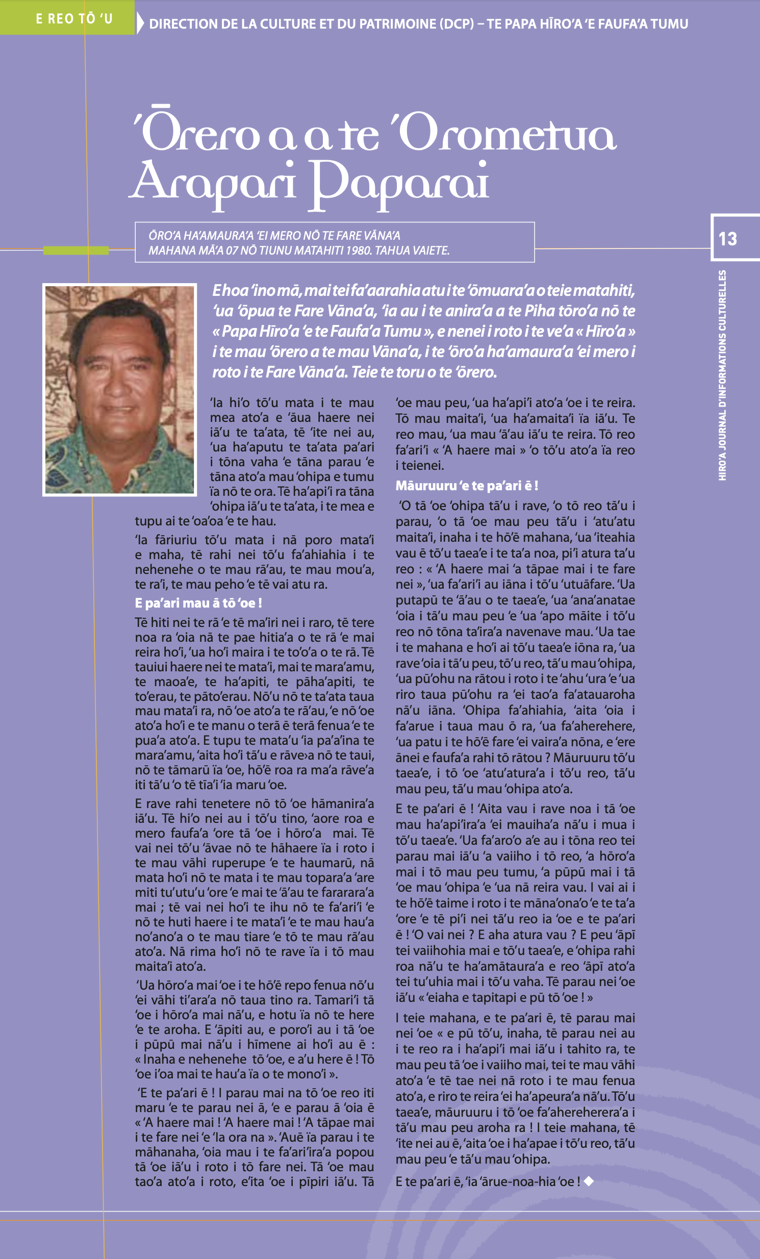 ‘Ōrero a te ‘Orometua Arapari Paparai (Hiro’a n° 214 – Octobre 2025)