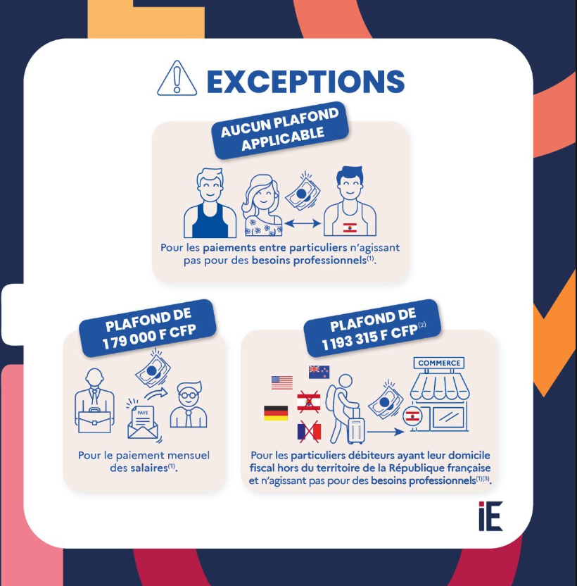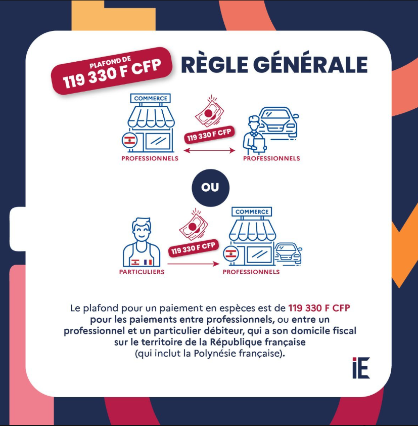Le montant maximum autorisé en espèces est fixé à 119 330 F CFP pour toute transaction réalisée entre professionnels, ou entre un professionnel et un particulier.