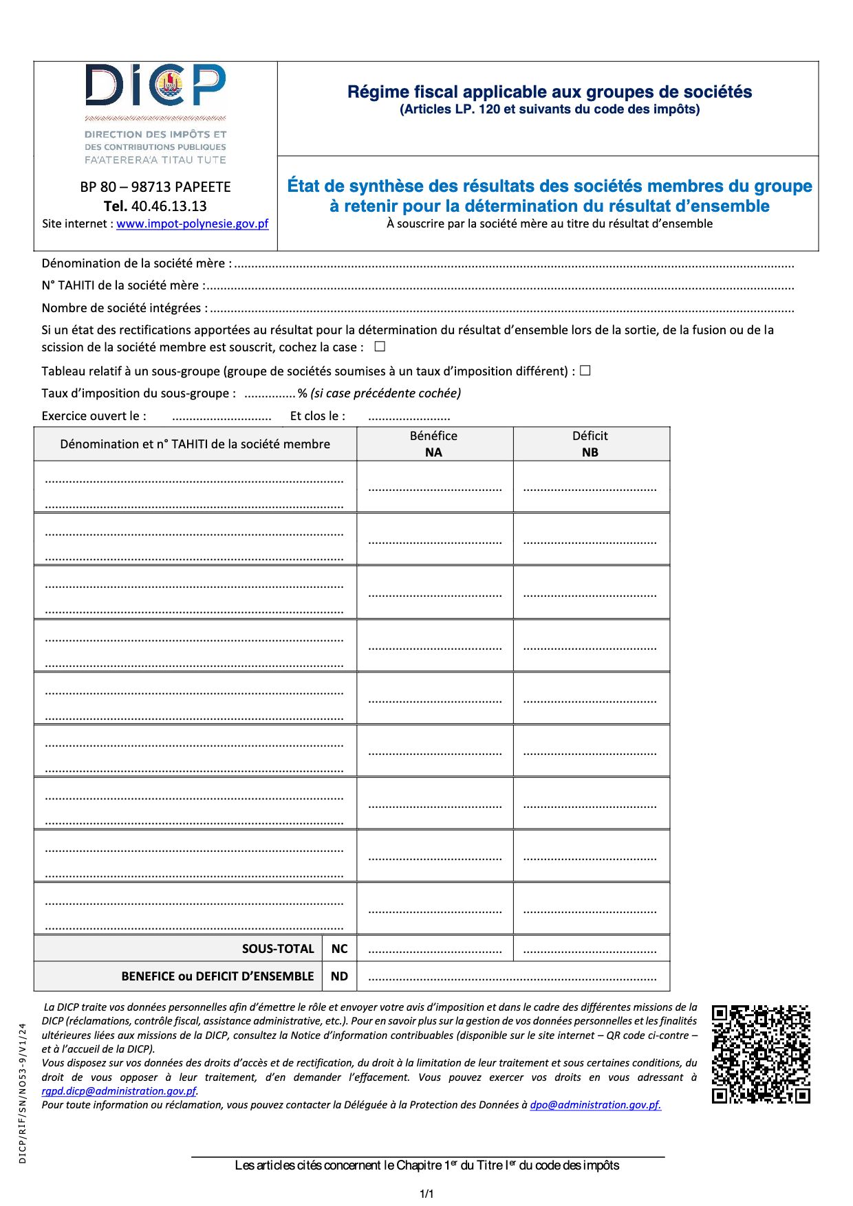 État de synthèse des résultats des sociétés membres du groupe à retenir pour la détermination du résultat d’ensemble