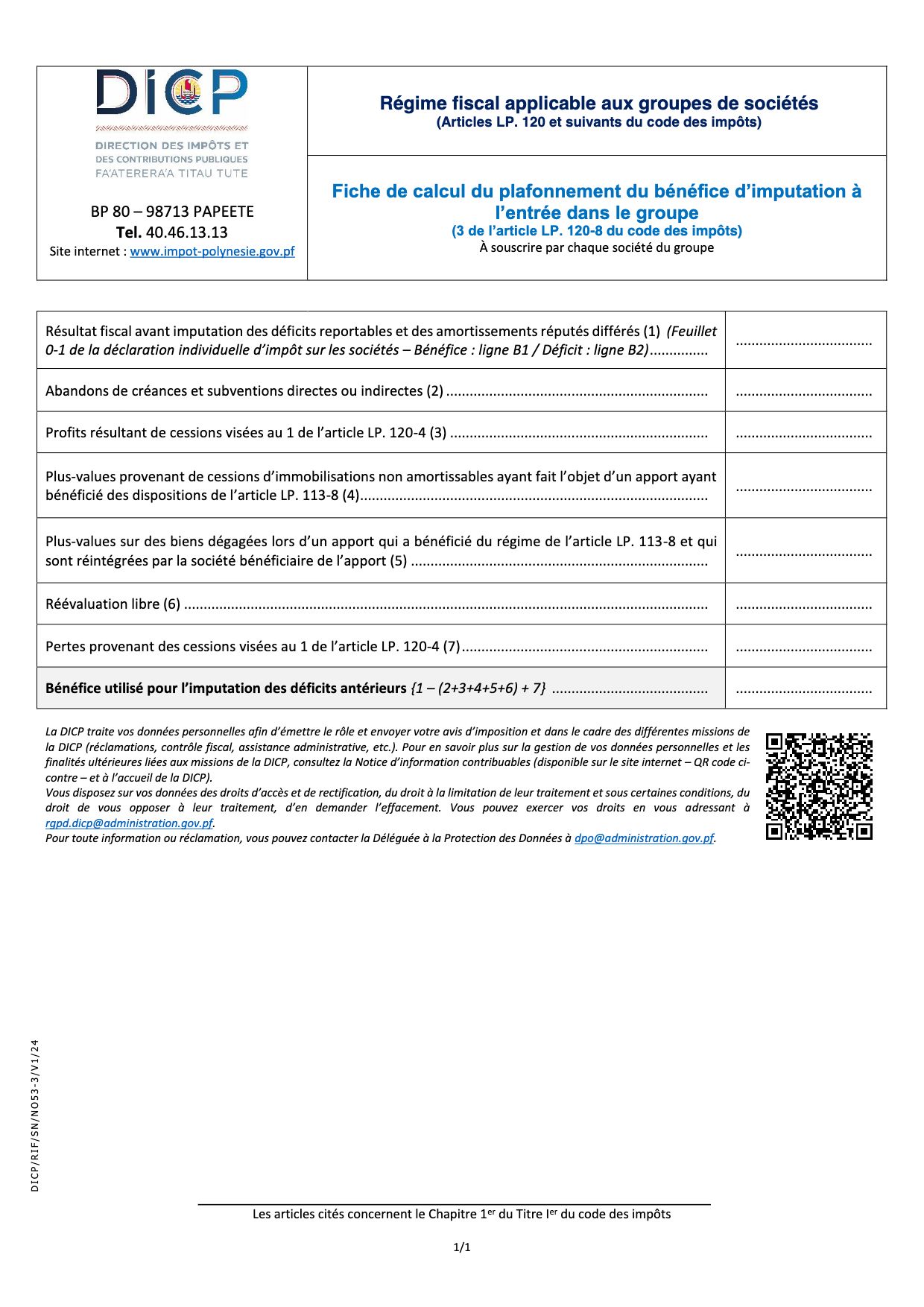Fiche de calcul du plafonnement du bénéfice d’imputation à l’entrée dans le groupe