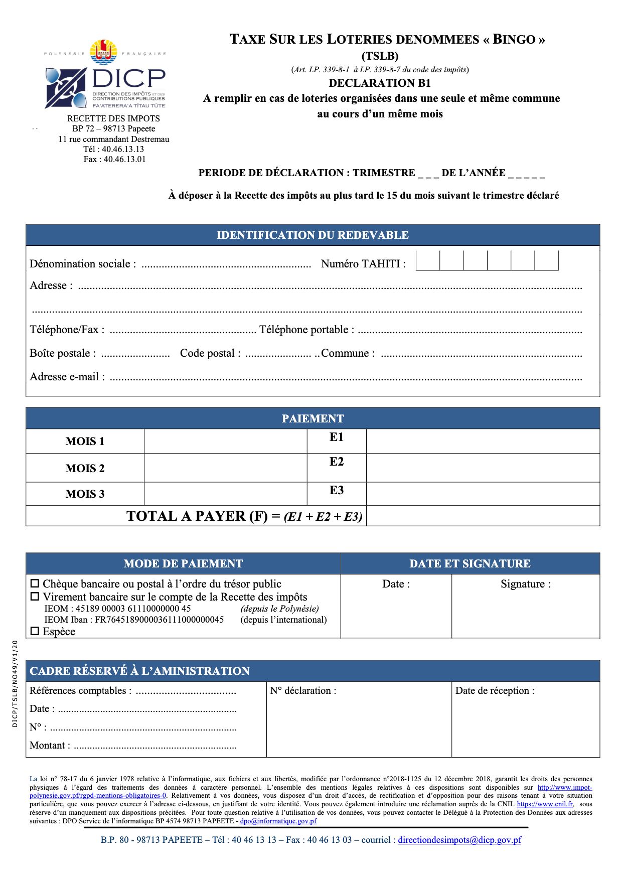 Formulaire de déclaration de la taxe sur les loteries dénommées « BINGO » – B1 dans une seule communes