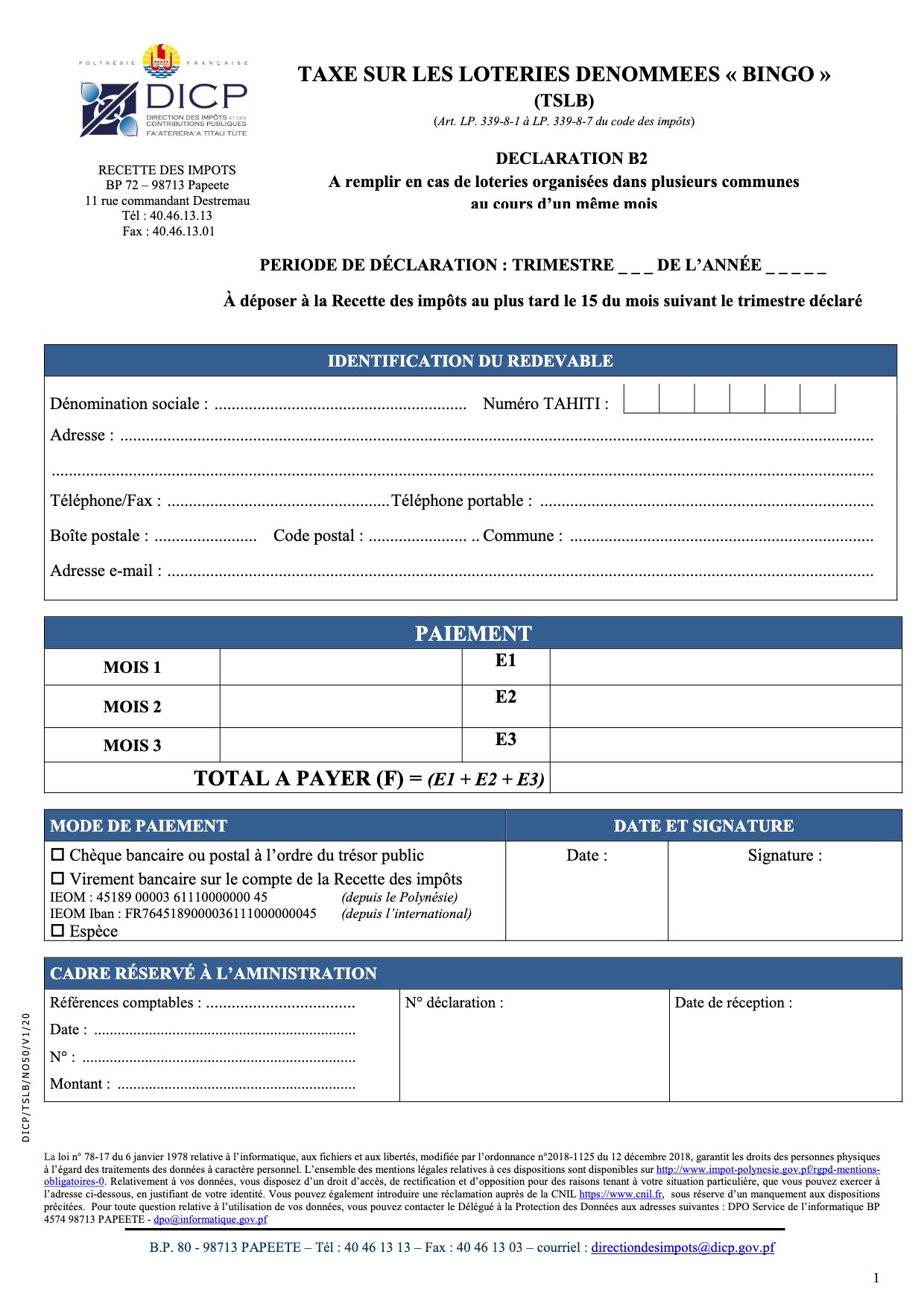 Formulaire de déclaration de la taxe sur les loteries dénommées « BINGO » – B2 dans plusieurs communes