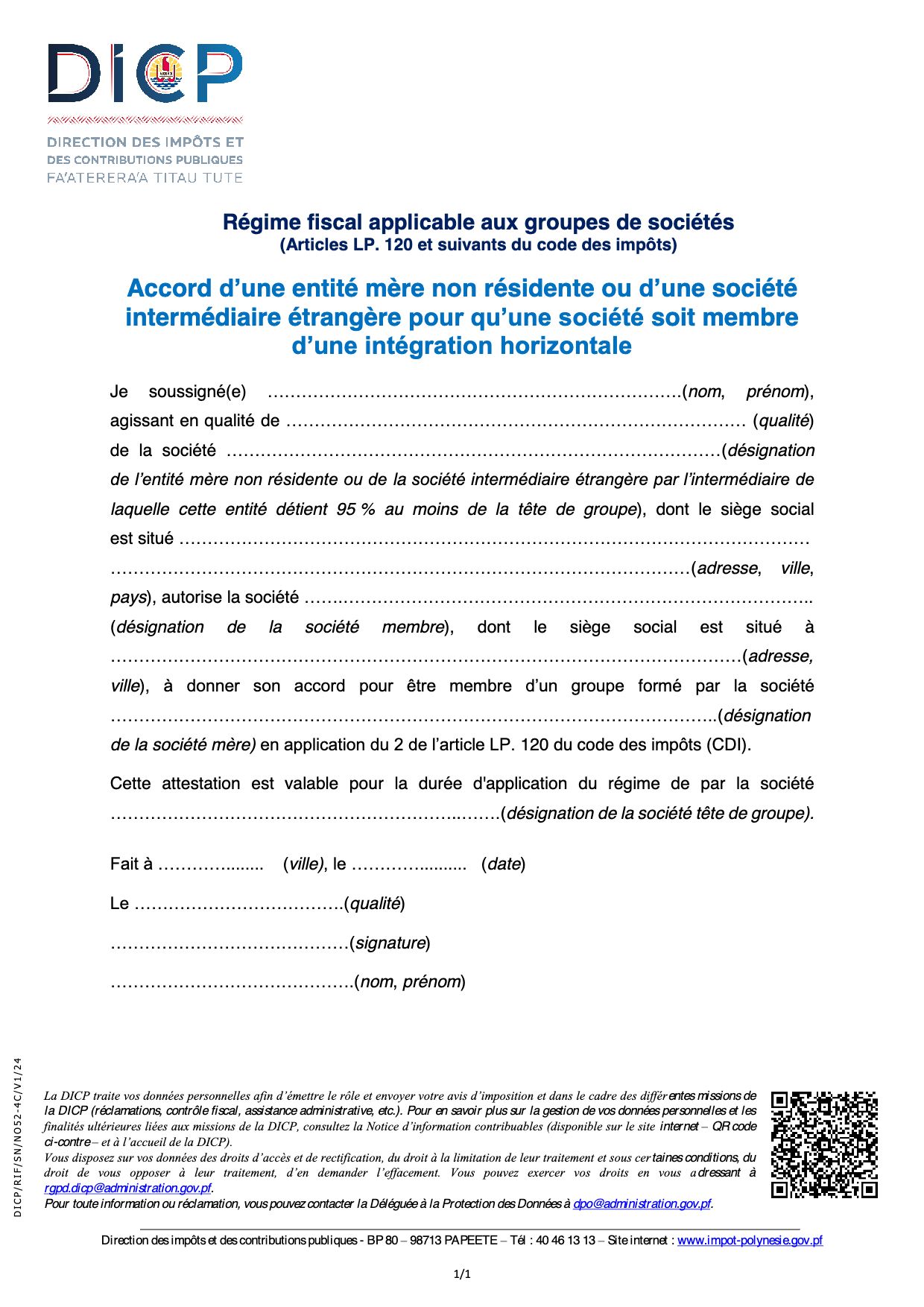 RIF – Accord d’une entité mère non résidente ou d’une société intermédiaire étrangère pour qu’une société soit membre d’une intégration horizontale