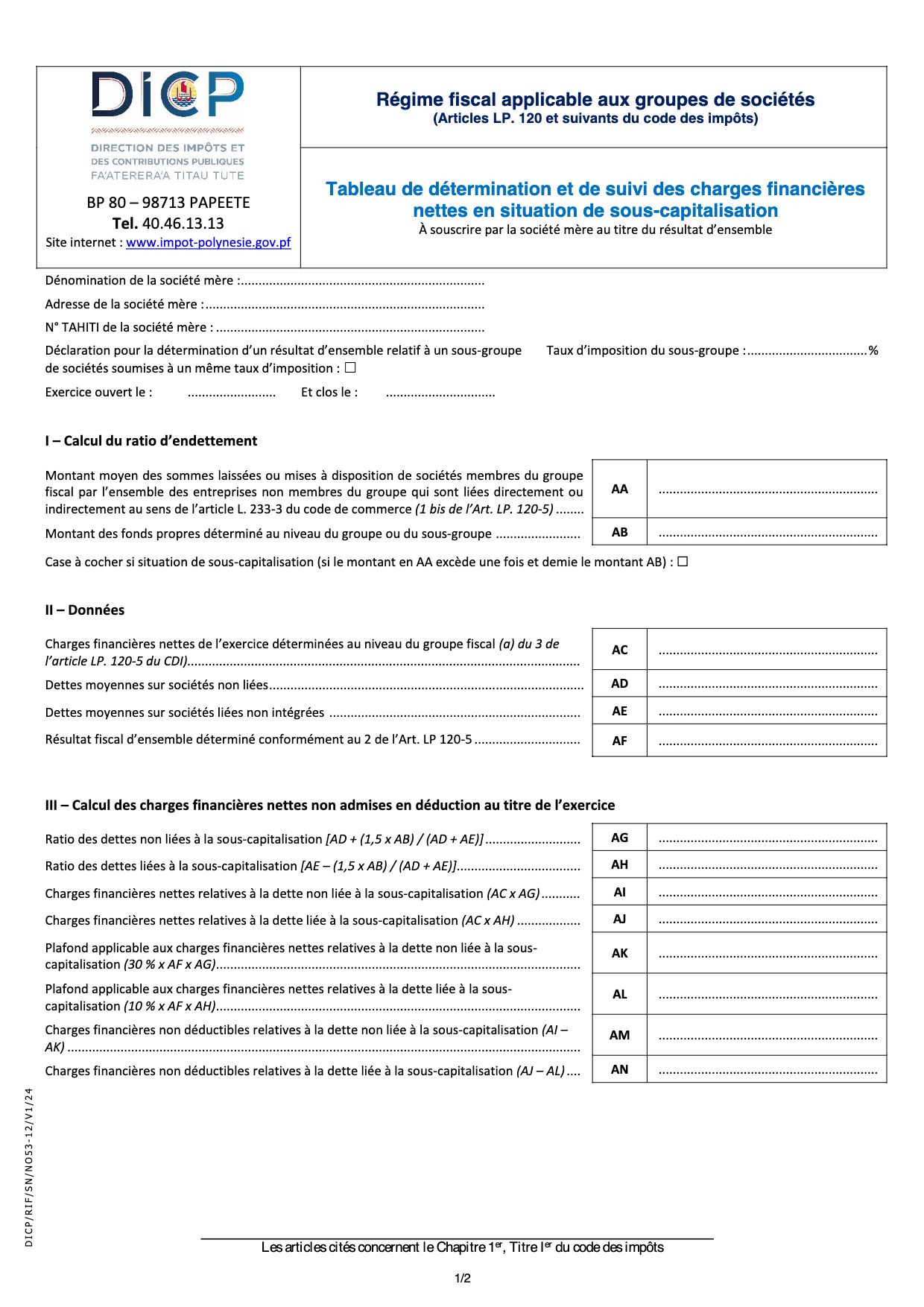 Tableau de détermination et de suivi des charges financières nettes en situation de sous-capitalisation