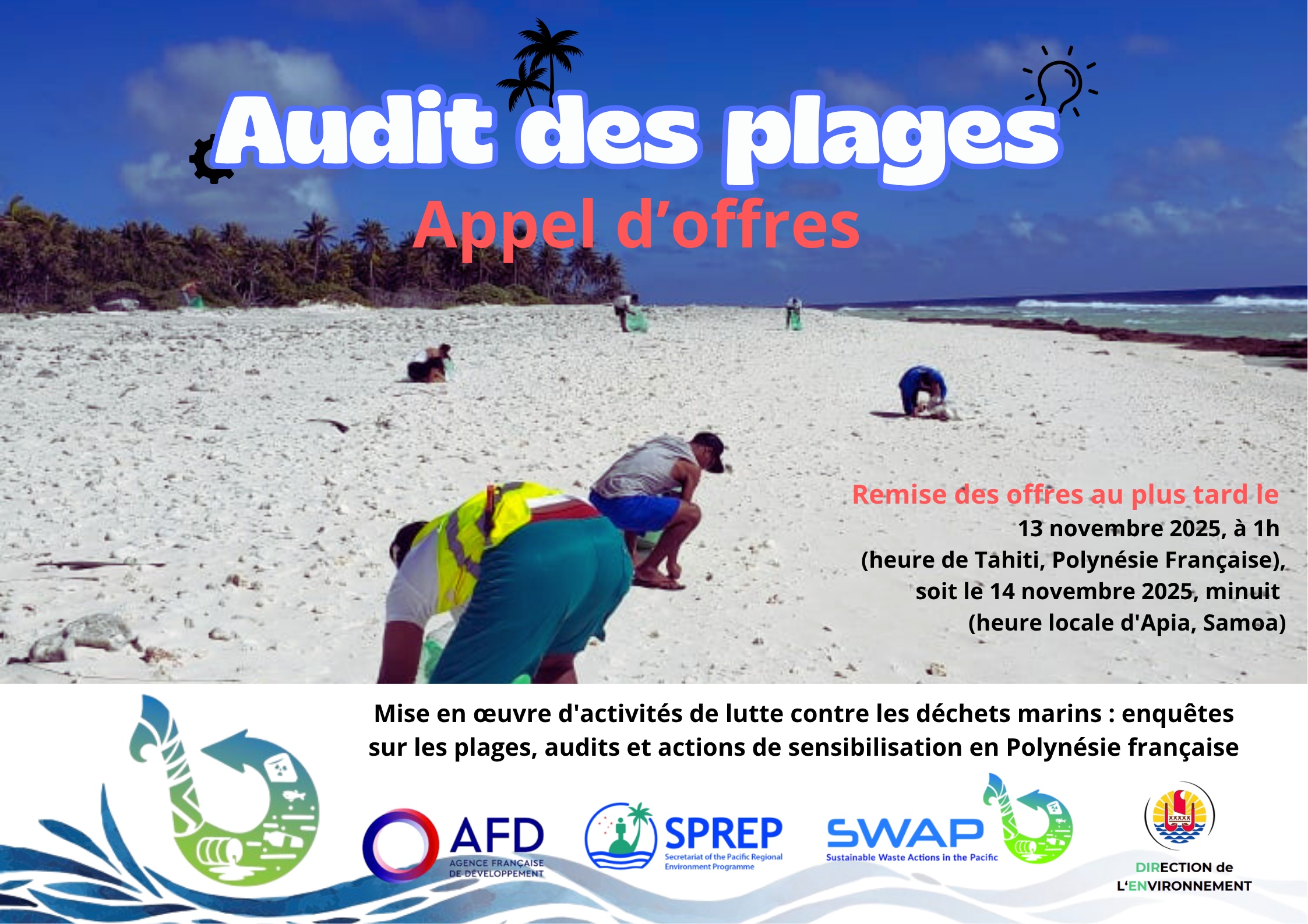 🌱 Appel d'offres – Mise en œuvre d'activités de lutte contre les déchets marins : enquêtes sur les plages, audits et actions de sensibilisation en Polynésie française Dans le cadre du projet régional SWAP2, financé par l’AFD et mis en œuvre par le PROE en partenariat avec la Direction de l’Environnement (DIREN), un appel [...]