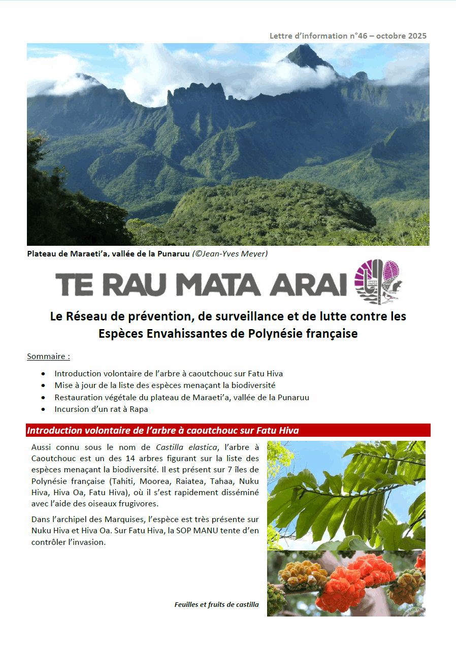 Aujourd’hui, 52 espèces animales et végétales introduites sont classées selon le code de l’environnement en tant qu' »espèces menaçant la biodiversité de Polynésie française ».
