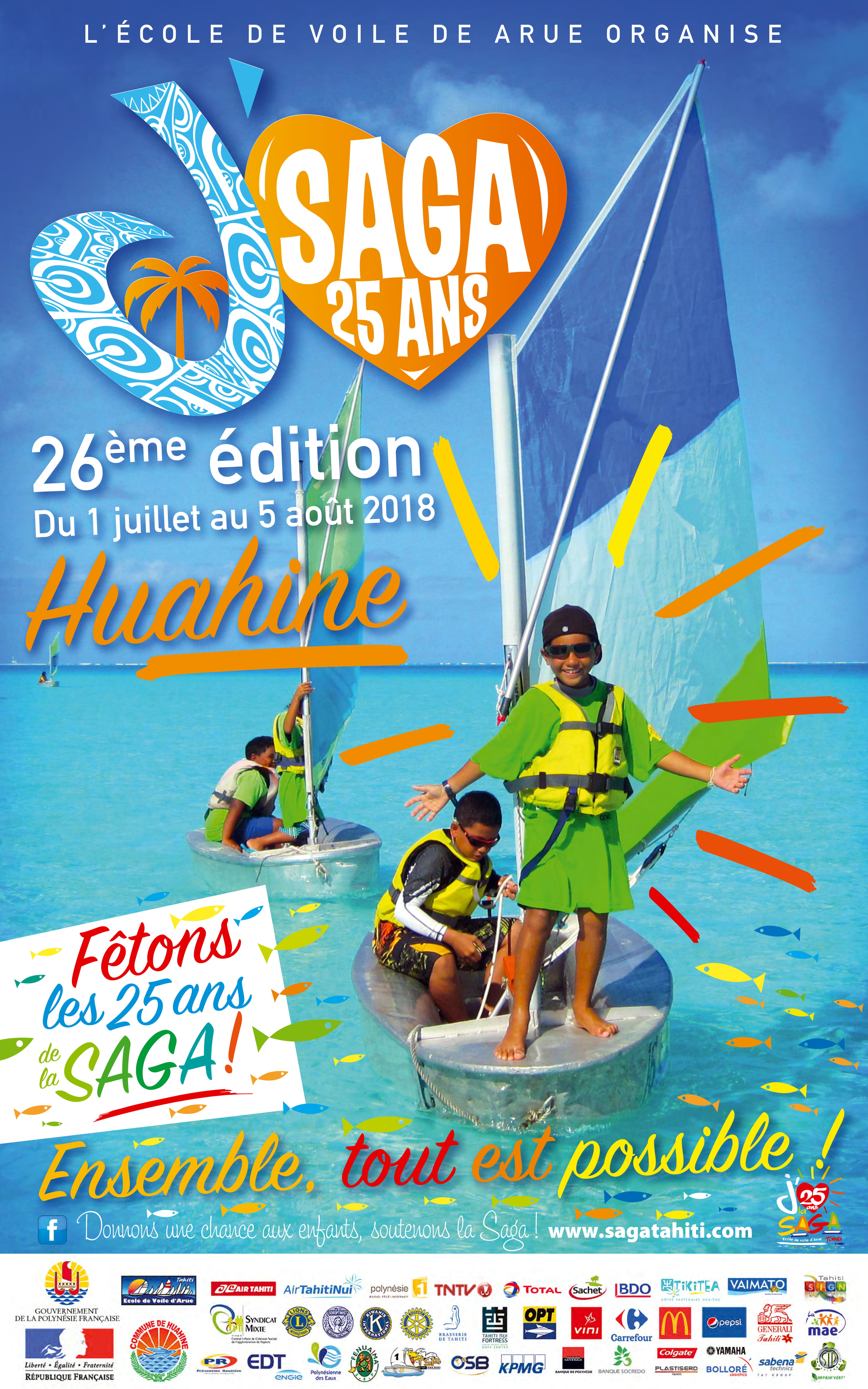 Initié par Henri Cornette de Saint-Cyr, dit « Doudou » et le Bureau de l’École de Voile d’Arue ; la première destination fut Rangiroa en 1993, puis Huahine, Makemo, Tikehau, Bora Bora, Maupiti, Raiatea, Tahaa, Moorea. Certaines d’entre elles ont été visitées plusieurs fois à la demande de ses habitants heureux et fiers d’accueillir les enfants de la Saga. C’est le cas pour l’île de Huahine, qui accueille la Saga pour la cinquième fois en 25 ans. En plus d’offrir un lieu parfait pour la navigation avec son large plan d’eau dans un lagon turquoise, le Motu Taiahu accueille la Saga sur une plage de sable blanc, sans dangers pour les enfants.