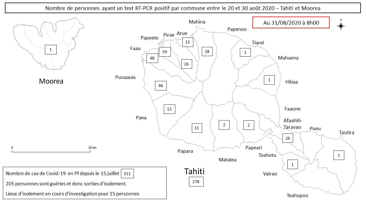 Les cas actifs sont localisés dans les communes urbaines de Tahiti, ainsi qu’à Bora-Bora et Raiatea.