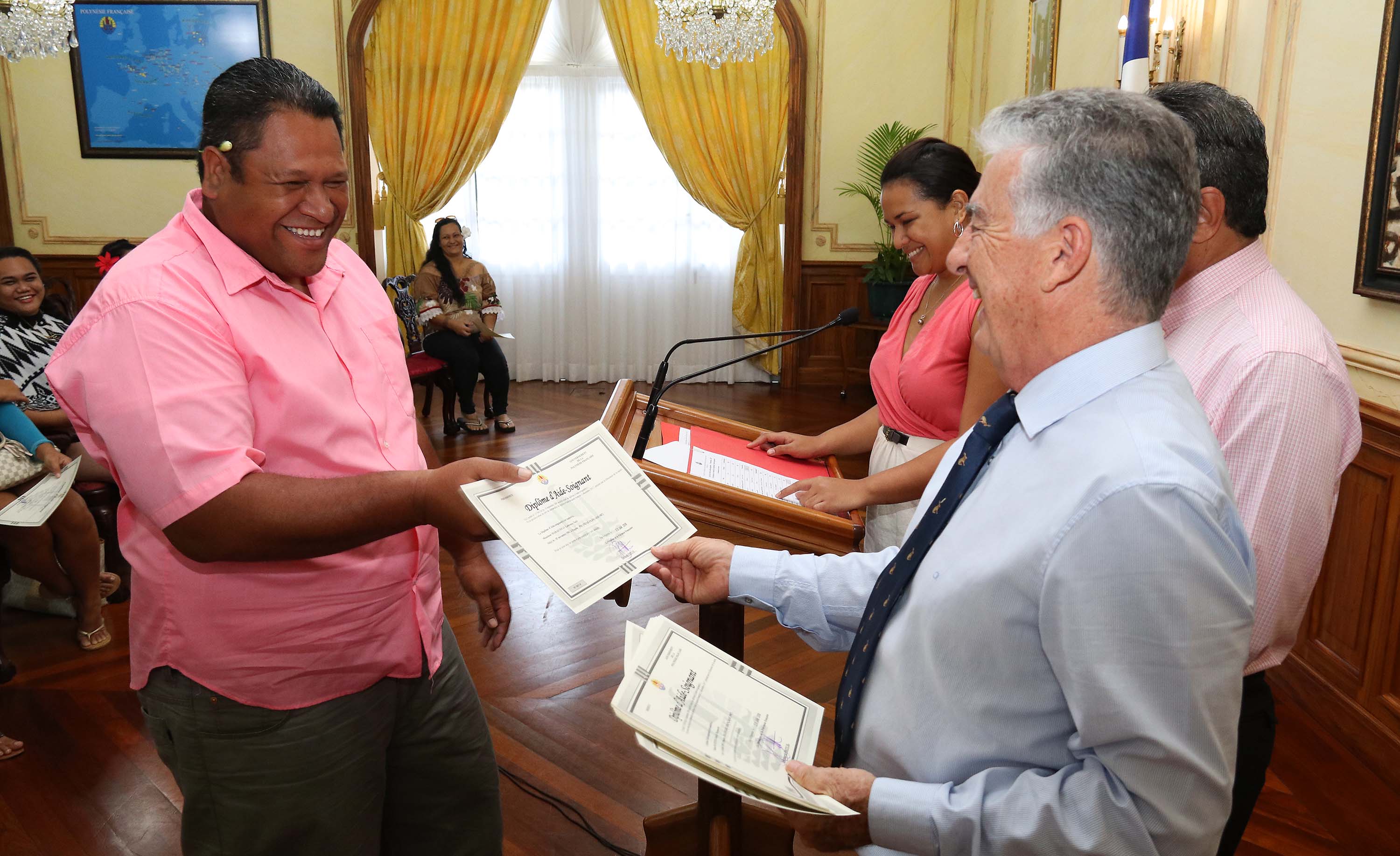 Le Président Edouard Fritch, en présence du ministre des Solidarités et de la santé, Jacques Raynal et de la Directrice de la santé, Laurence Bonnac-Theron, a remis, jeudi matin, les diplômes des aides-soignants de la promotion 2017.