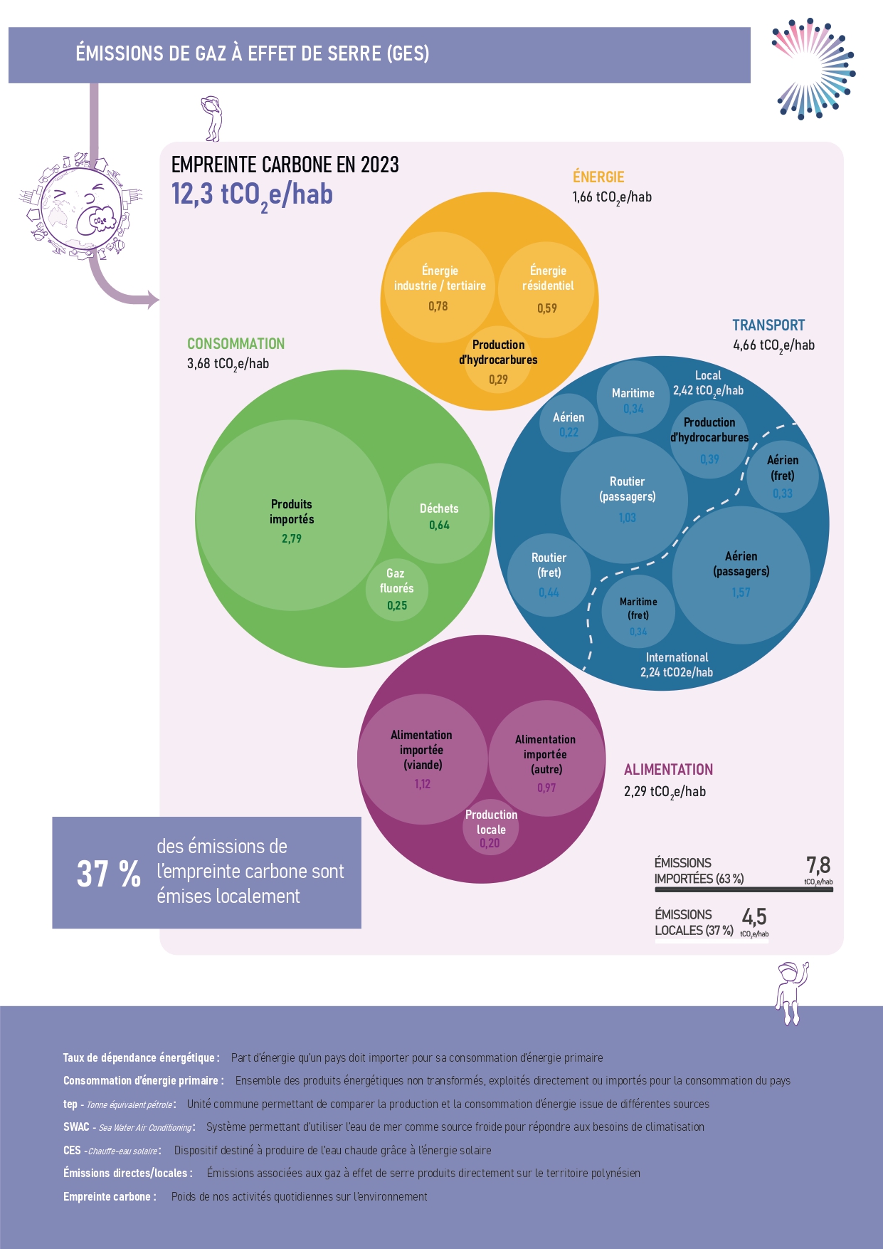 91,9%C’est le taux de dépendance énergétique, il indique la part d’énergie que la Polynésie française doit importer pour sa consommation d’énergie primaire. Ce taux est relativement stable, avec une moyenne de 93,2 % pour la dernière décennie. Ce pourcentage montre les efforts à fournir pour tendre vers l’autonomie énergétique. |