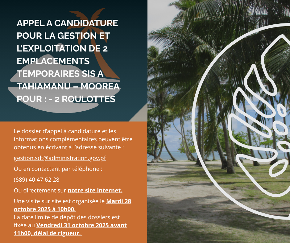 [APPEL A CANDIDATURE] – 2 Emplacements de roulottes pour la plage de Tahiamanu à Moorea Par hschacht|2025-10-13T10:59:59-10:0013 Oct 2025|Non classé| Lire la suite Commentaires fermés sur [APPEL A CANDIDATURE] – 2 Emplacements de roulottes pour la plage de Tahiamanu à Moorea