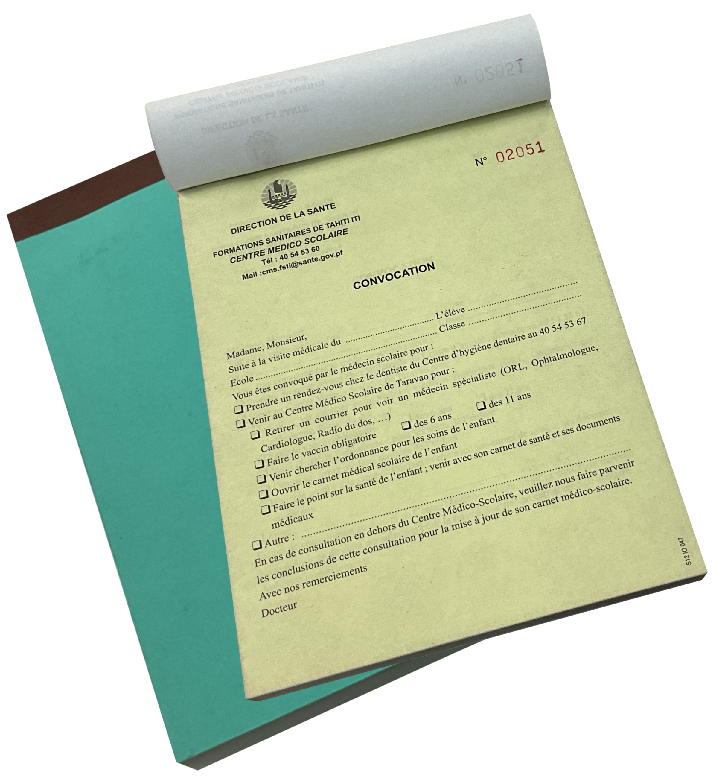 2 à 4 volets en papier autocopiant, de couleurs différentes, avec ou sans numérotation, et avec ou sans titre sur la couverture.